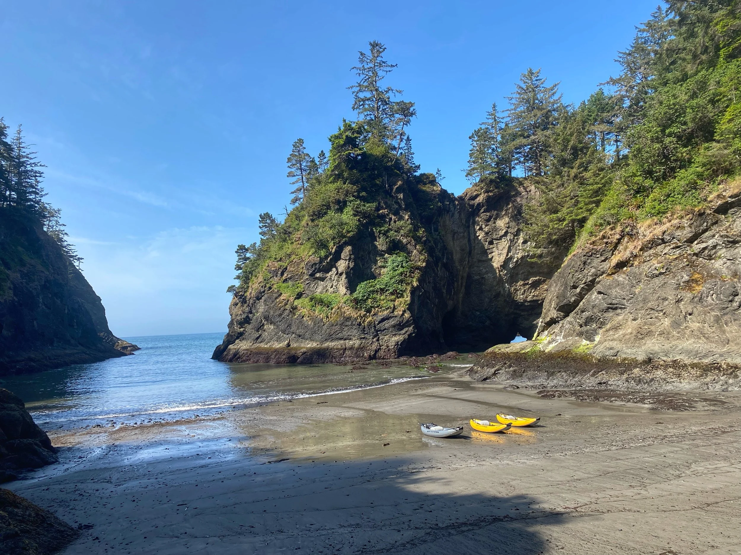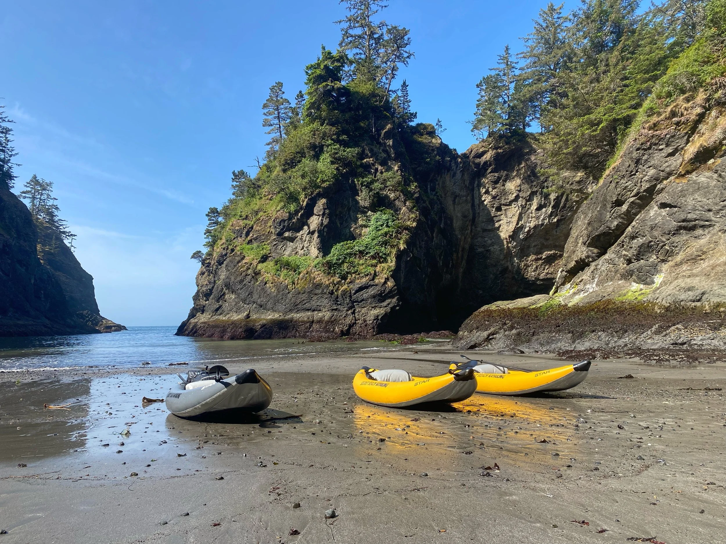 All groups must make reservations by 8 pm the day before. Trips begin in the morning at the Secret Beach Trailhead located just off HWY 101 in the Samuel Boardman Scenic Corridor. Look for our white trailer and yellow boats in the parking lot.